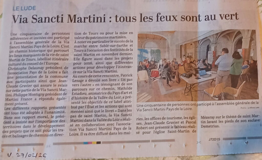 Une cinquantaine de personnes adhérentes et invitées ont participé à l’assemblée générale de la Via Sancti Martini Pays de la Loire. Cest un chemin historique qui parcourt les lieux marquants de la vie de saint Martin de Tours, labellisé itinéraire culturel du conseil de l’Europe.