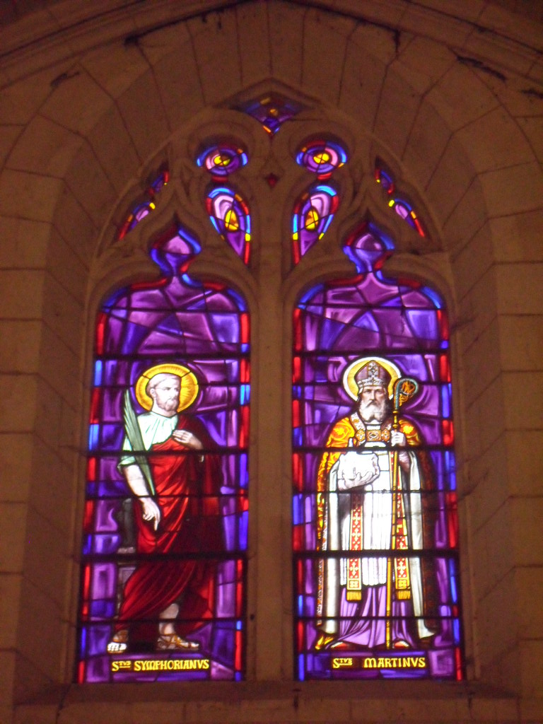 This stained glass window was donated to the parish by Mr. and Mrs. Morin, former owners of the Château de Larçay, in 1877. It is located on the high window of the south wall of the nave of the church of Saint-Symphorien in Larçay. Saint Martin is represented as a bearded bishop, nimbed and mitred, holding his crosier in his left hand and a church in his right hand. At the foot of the window, one can read: Stus MARTINUS.